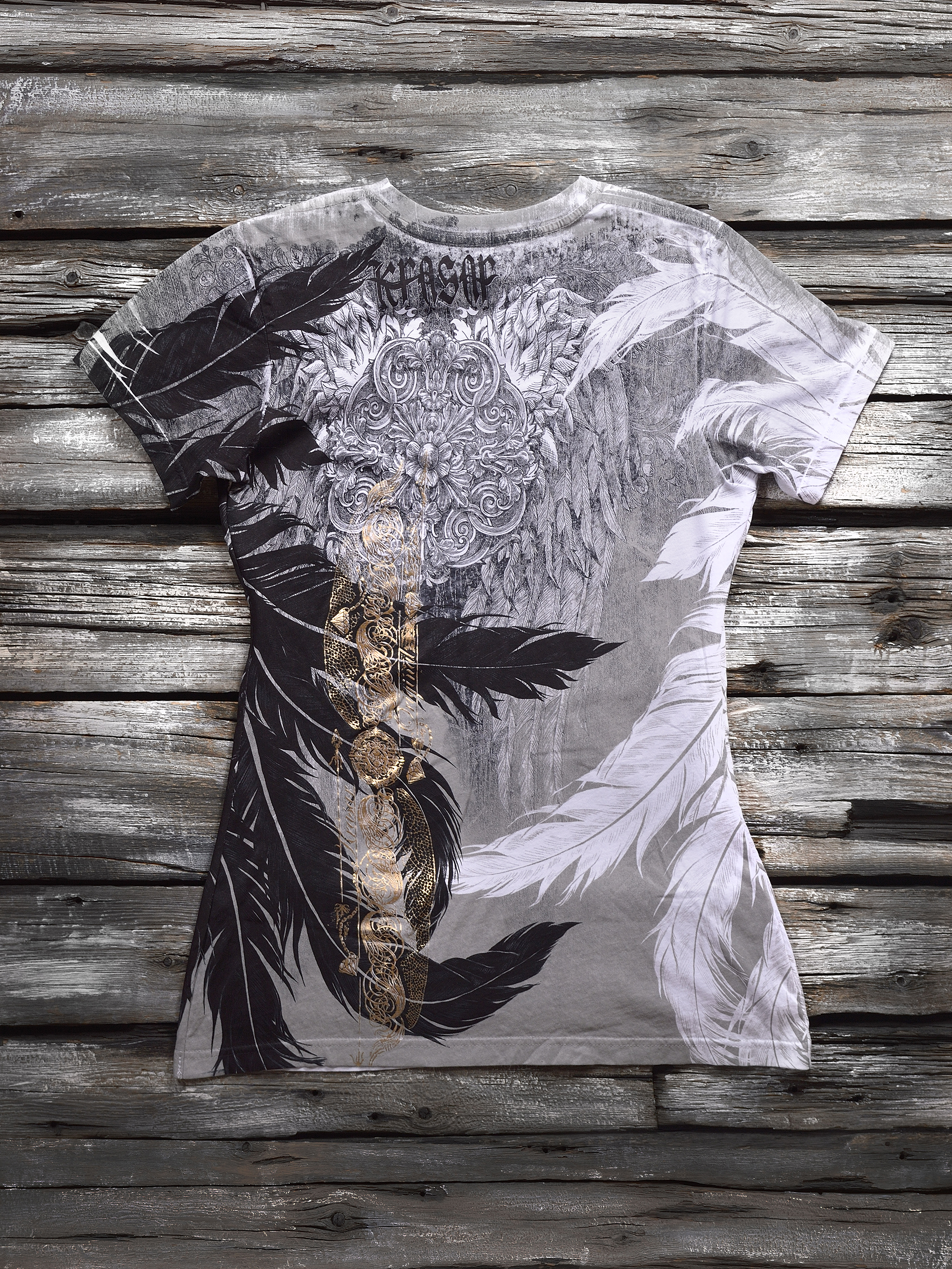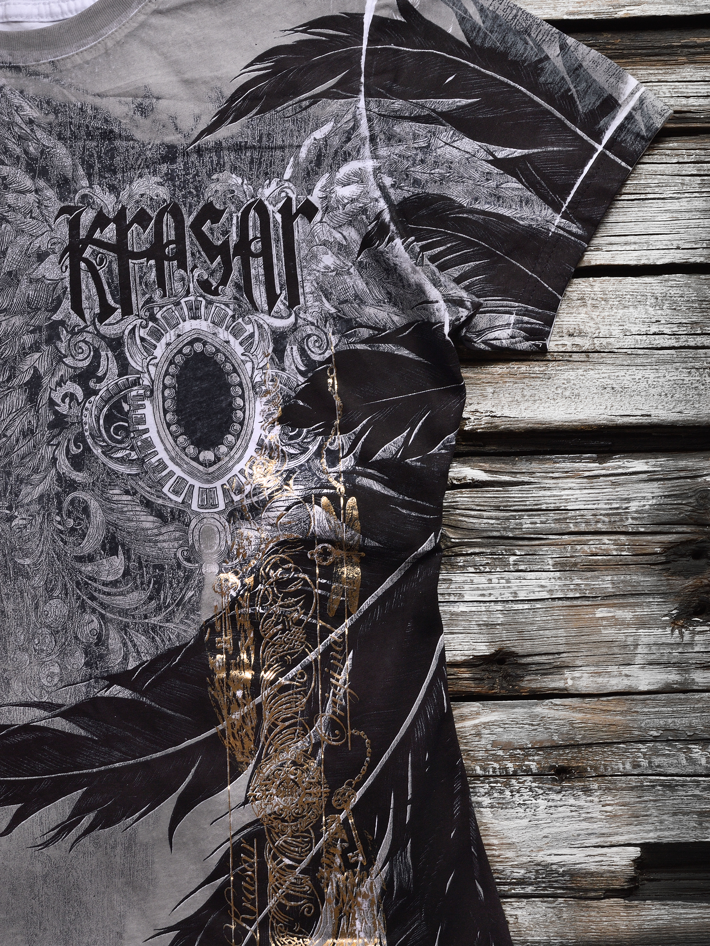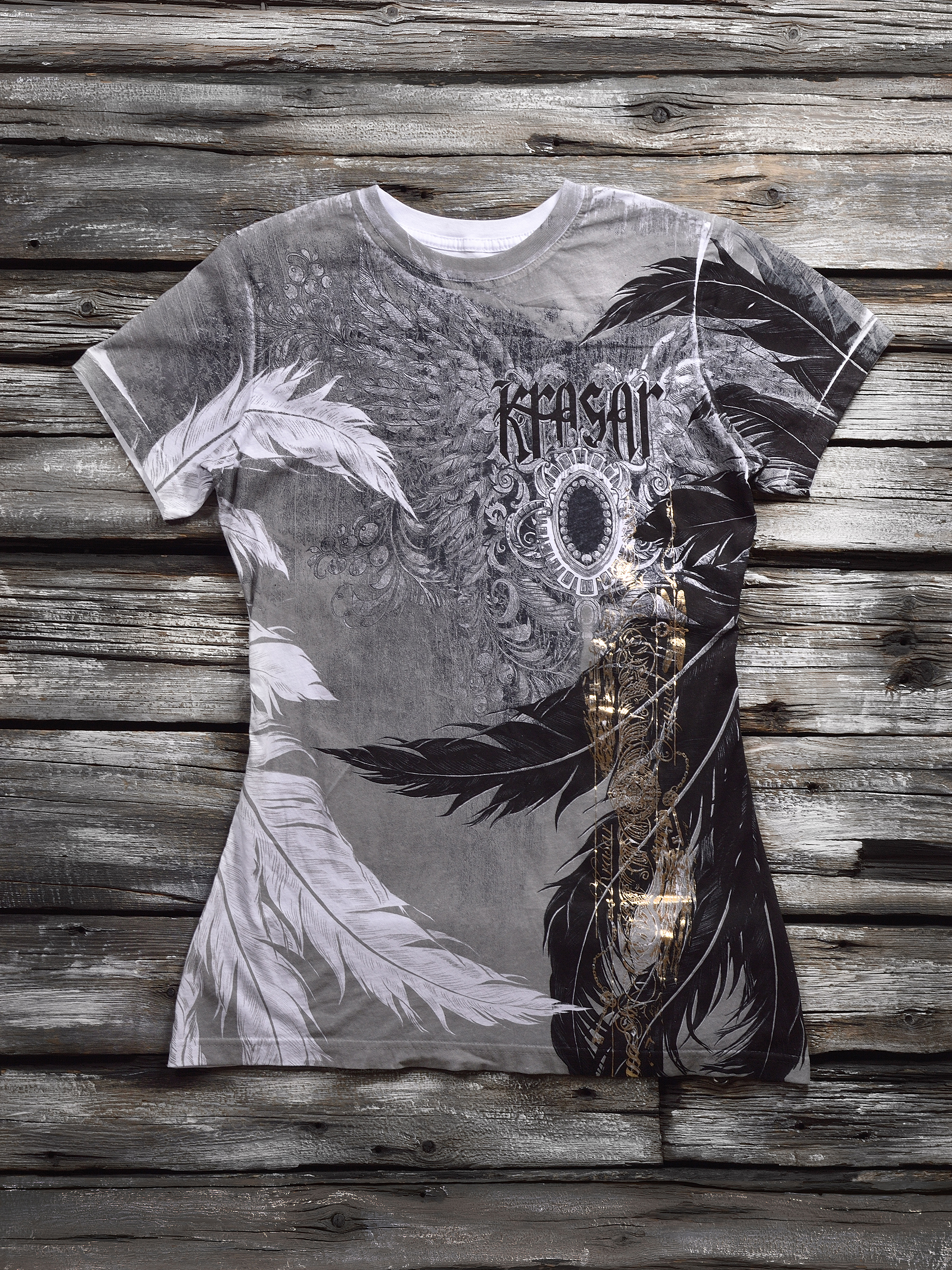 • Рисунок данной модели создан профессиональными художниками компании KRASAR. Цвета и оттенки подобраны таким образом, чтобы стильная футболка хорошо сочеталась с джинсовой одеждой. Принт нанесён с передней и задней стороны футболки и является единым целым с тканью и не ощущается при прикосновении к нему. Отсутствует эффект резиновой наклейки. Отдельные элементы рисунка выполнены декоративным фольгированием, что придаёт изделию более яркий и привлекательны вид. Благодаря передовой технологии печати рисунок не смоется и не потрескается даже после многочисленных стирок. Истиранию со временем подвержены только элементы из фольги, которые при соблюдении рекомендаций по стирке - продержатся долго. Печать выполнена безопасными красками, что исключает аллергическую реакцию на коже.