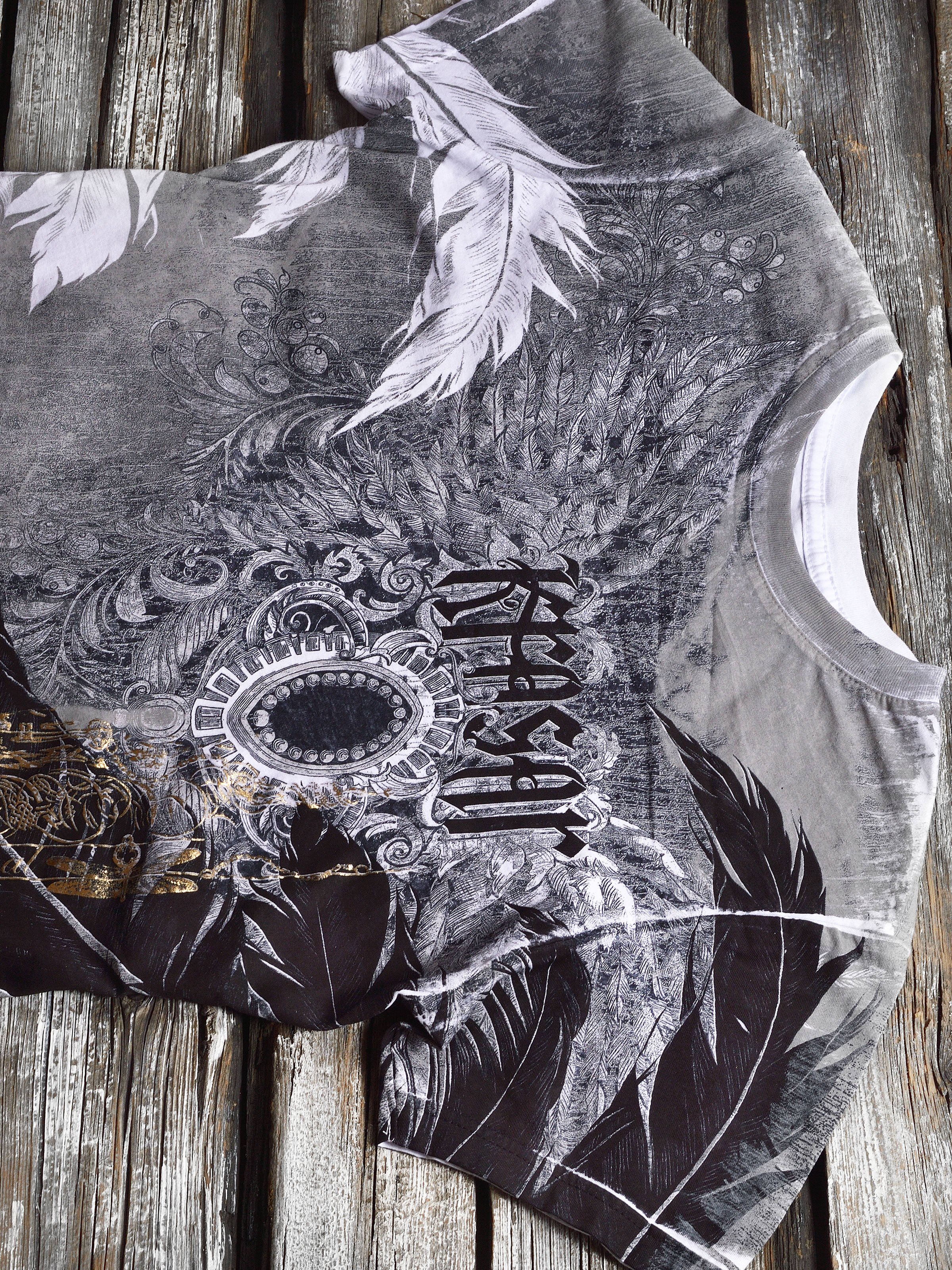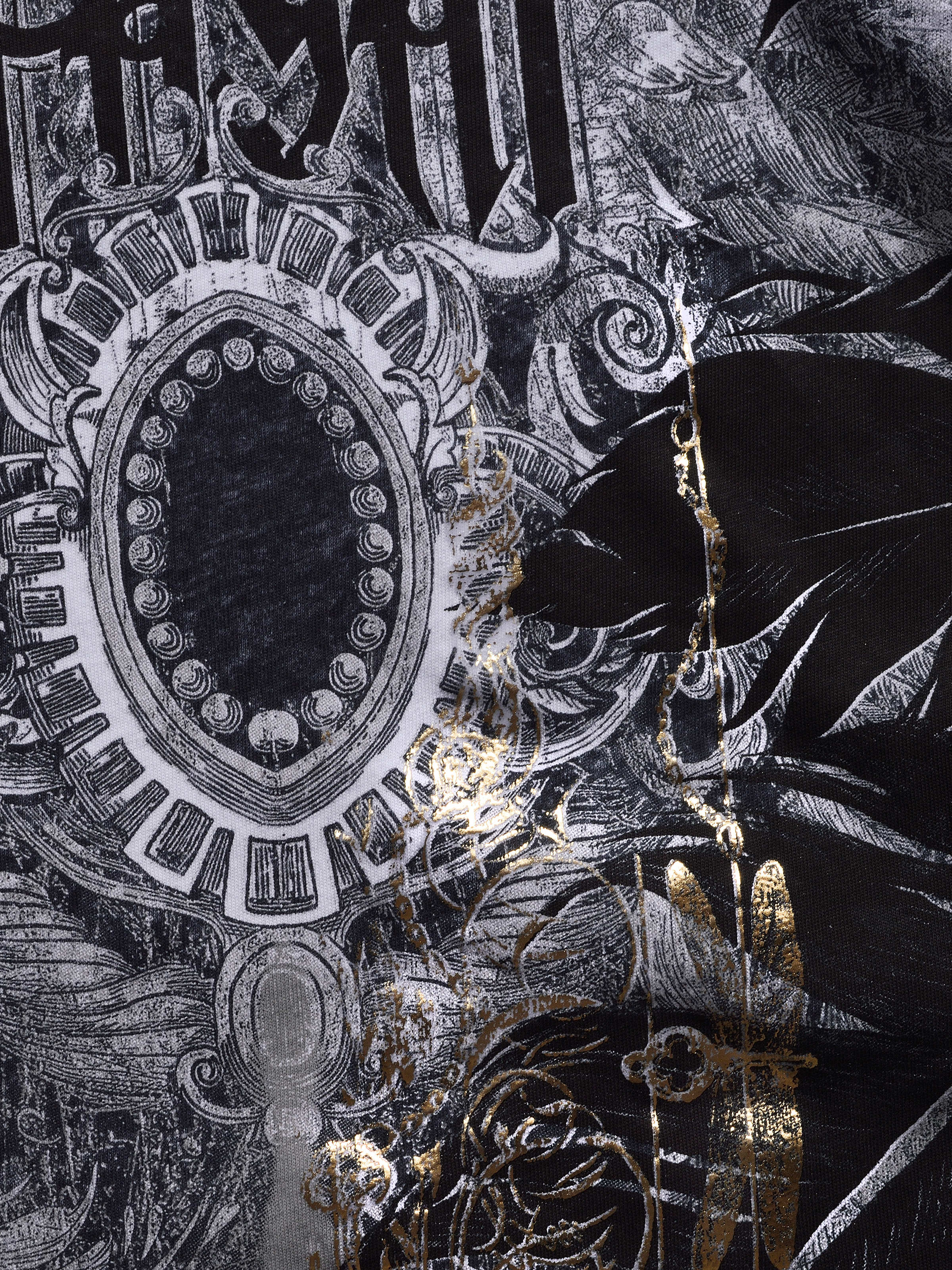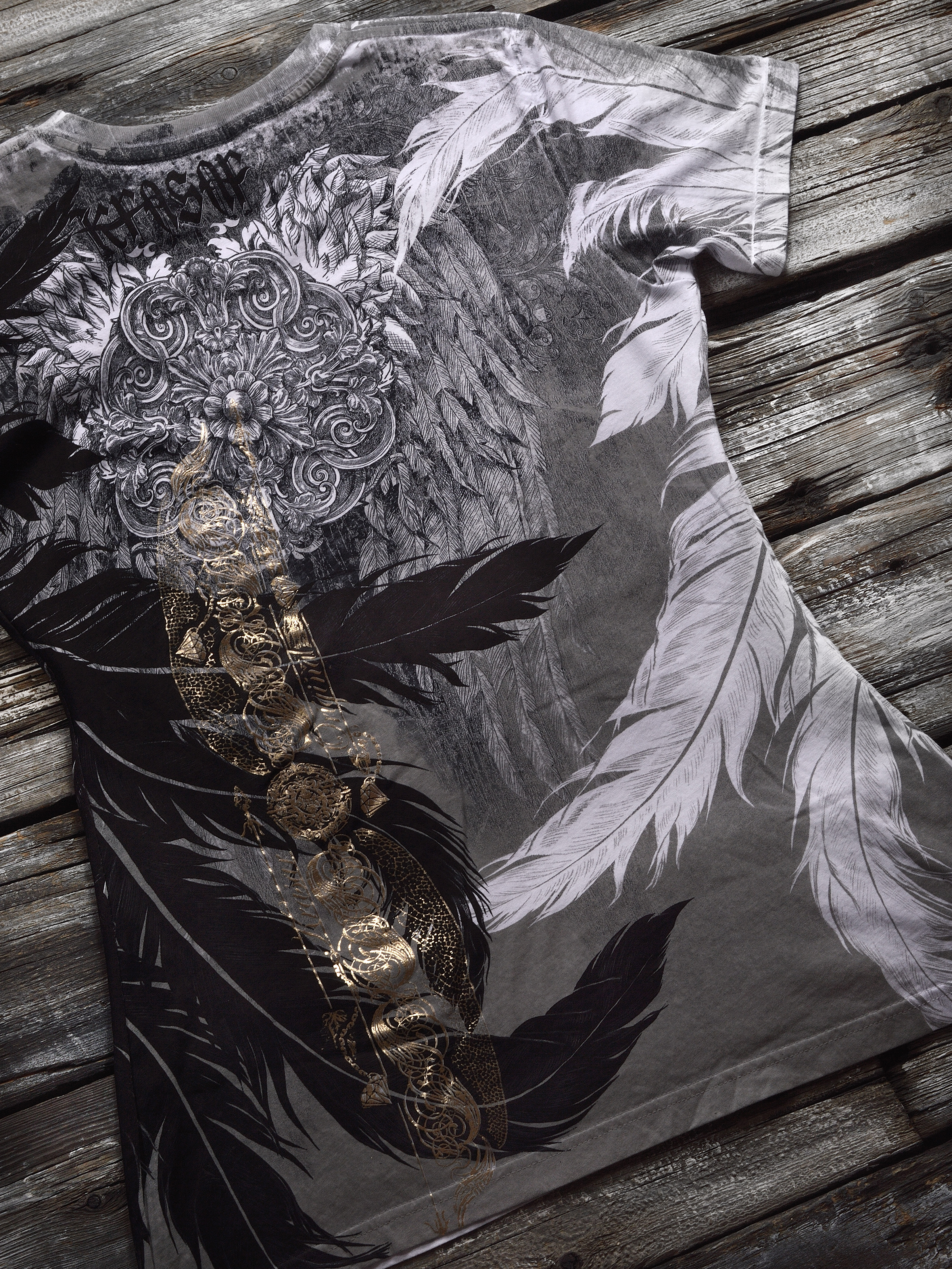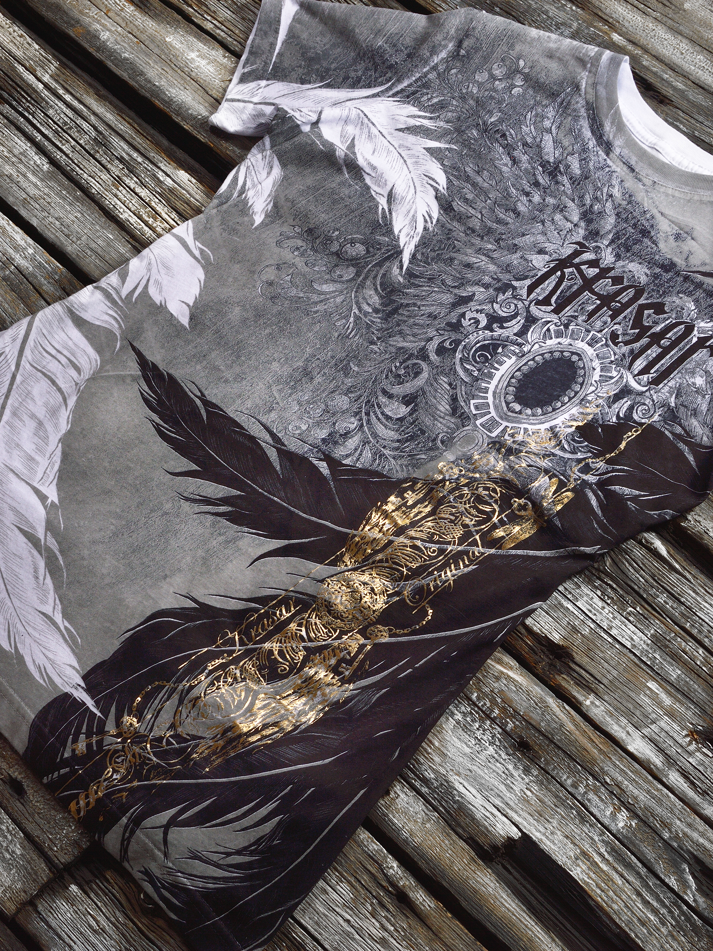 • Рисунок данной модели создан профессиональными художниками компании KRASAR. Цвета и оттенки подобраны таким образом, чтобы стильная футболка хорошо сочеталась с джинсовой одеждой. Принт нанесён с передней и задней стороны футболки и является единым целым с тканью и не ощущается при прикосновении к нему. Отсутствует эффект резиновой наклейки. Отдельные элементы рисунка выполнены декоративным фольгированием, что придаёт изделию более яркий и привлекательны вид. Благодаря передовой технологии печати рисунок не смоется и не потрескается даже после многочисленных стирок. Истиранию со временем подвержены только элементы из фольги, которые при соблюдении рекомендаций по стирке - продержатся долго. Печать выполнена безопасными красками, что исключает аллергическую реакцию на коже.