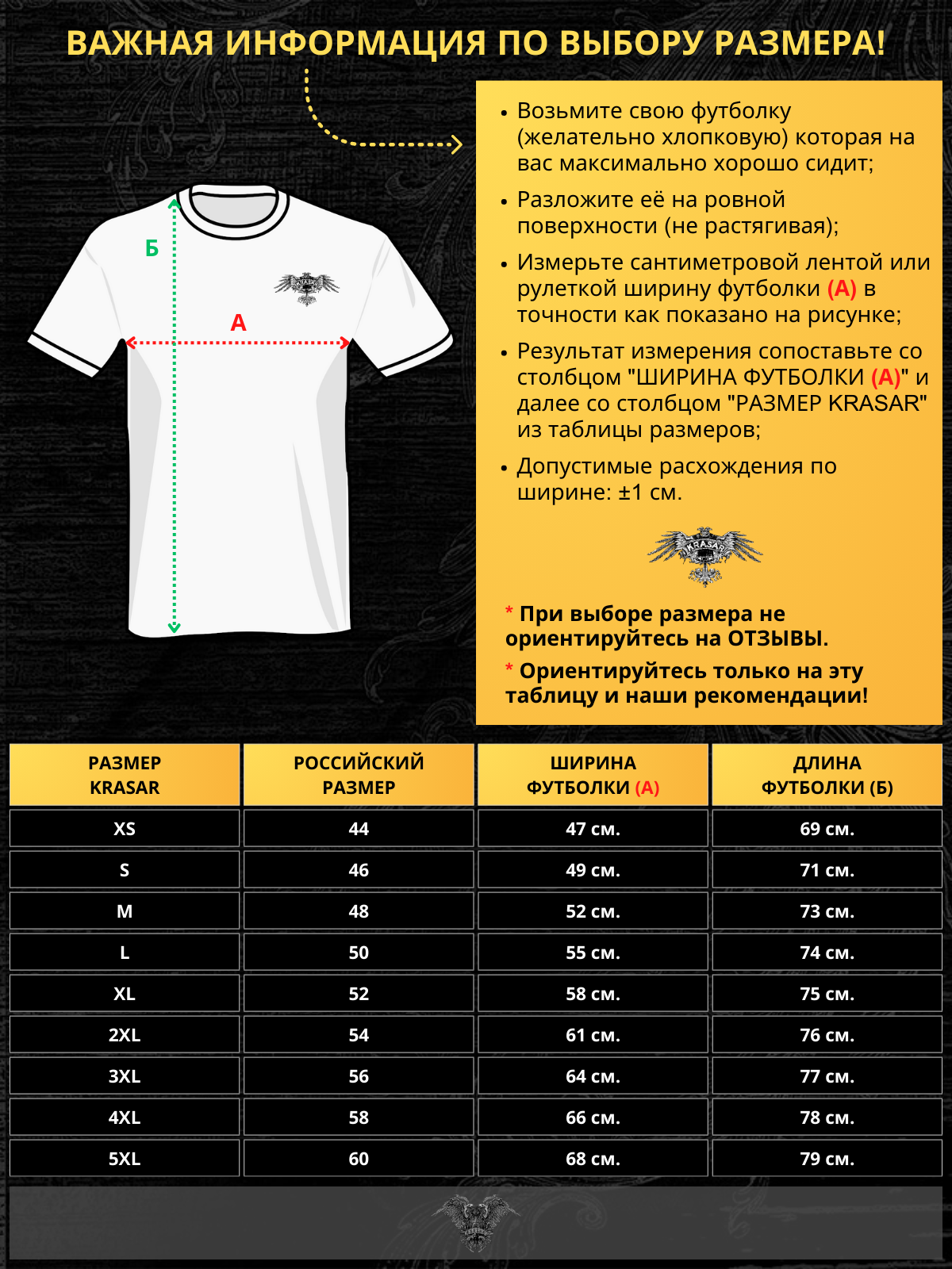 ❗️ ВАЖНАЯ ИНФОРМАЦИЯ ПО РАЗМЕРАМ: Чтобы правильно подобрать размер изделия KRASAR смотрите актуальную таблицу размеров в фотогалереи товара. Действуйте согласно инструкции по подбору размера с помощью измерения ширины своей футболки. Эта информация поможет вам безошибочно подобрать нужный размер. Если вы приобретали изделие KRASAR в прошлом - заказывайте такой же размер, как и ранее. Если делаете заказ впервые - ориентируйтесь исключительно на картинку с инструкцией и размерами, которая расположена в фотогалереи товара!